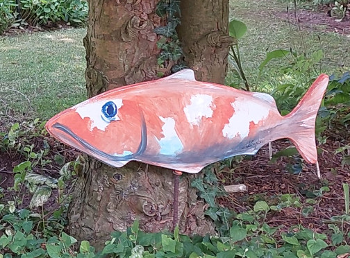 Jo, Thor Lykke Jensen, som er far til Jakob (læreren på produktionsskolen), sprang til og skar i træ en fisk, som lignede den oprindelige. Den var helt perfekt til formålet.