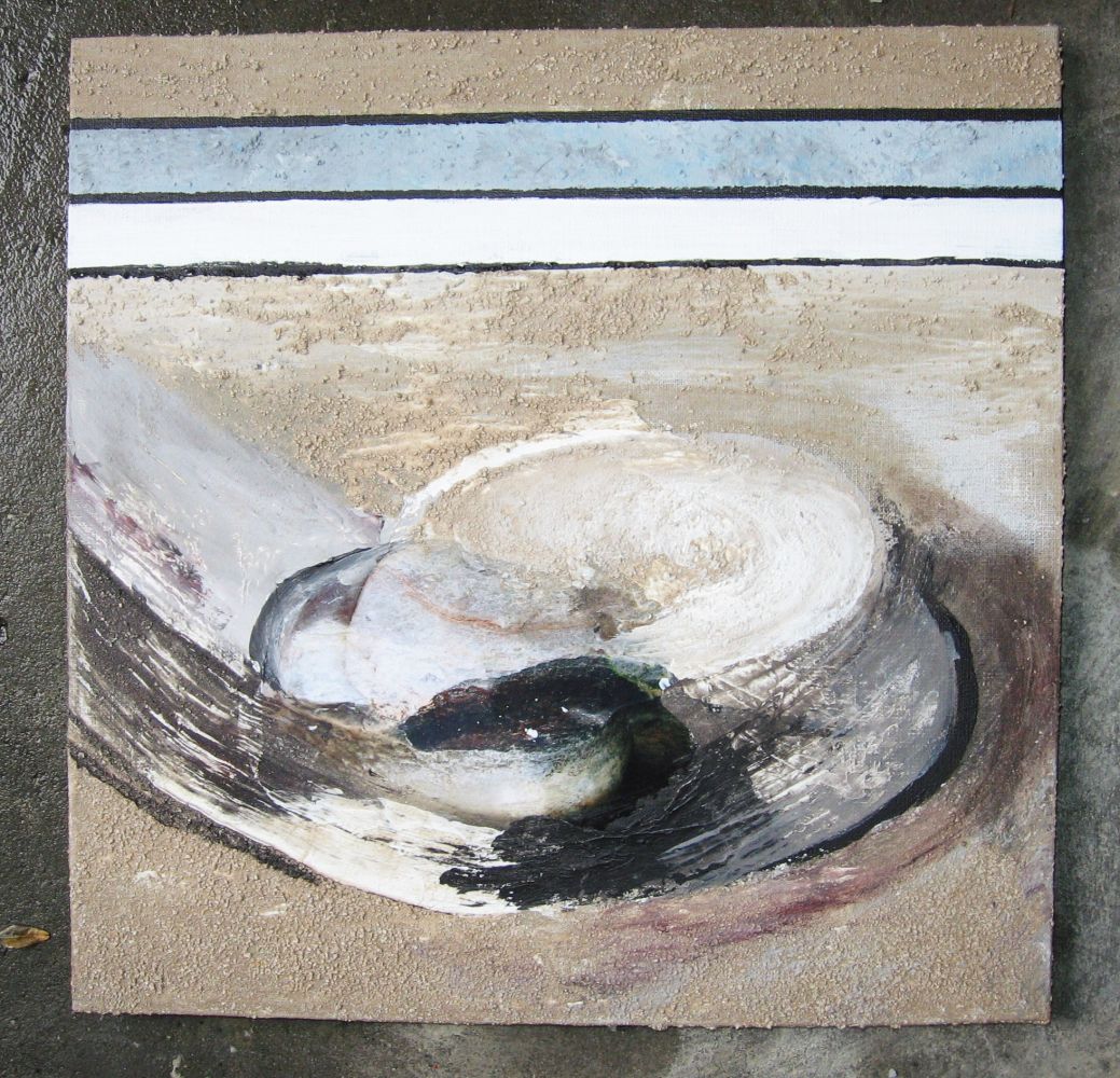 En del af mine billeder er en fusion af fotografi og maleri. Mange af fotografierne er taget i molergravene på Fur, limet op på lærred og brugt som inspiration til form og farve i billedet. Detaljen i moleret bliver til et nyt landskab eller figur. Endvidere har jeg brugt knust moler som malemiddel sammen med akryl.