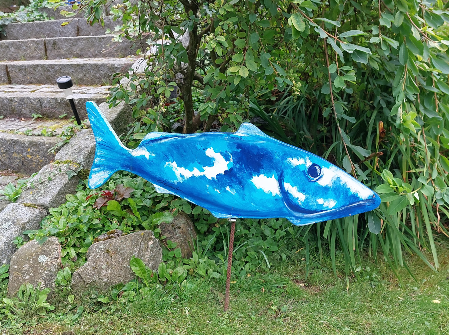 Jo, Thor Lykke Jensen, som er far til Jakob (læreren på produktionsskolen), sprang til og skar i træ en fisk, som lignede den oprindelige. Den var helt perfekt til formålet.
